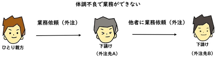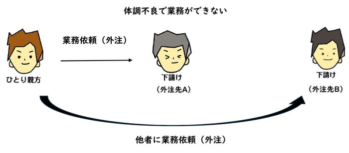外注先が体調不良等により業務ができない場合、外注先自ら他者に外注依頼。