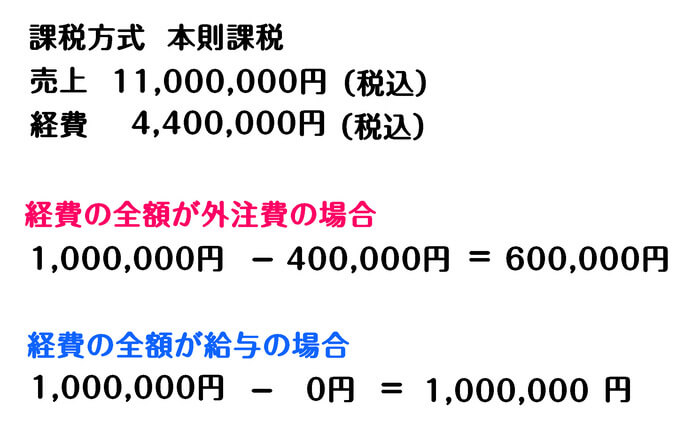 例えば、売上11,000,000円(税込)、経費4,400,000円(税込)の場合、経費が外注費 or 給与のいずれかにより、納付する消費税額が異なります。