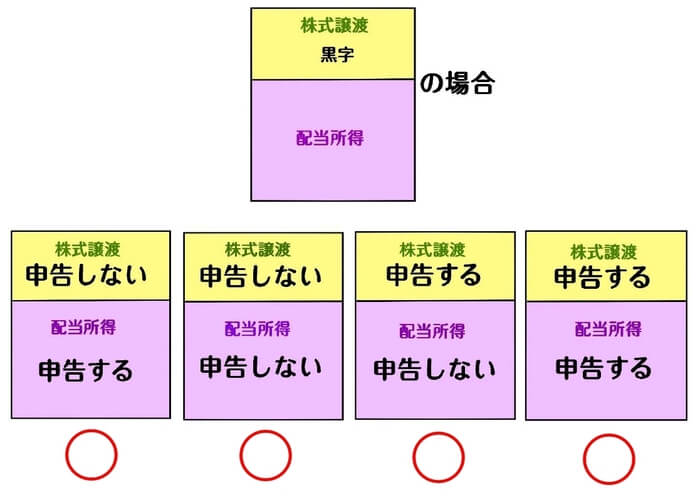 株式譲渡所得が黒字の場合、株式譲渡と配当所得は、いずれか一方を申告 or 両方申告 or 両方申告しないとしても構いません。