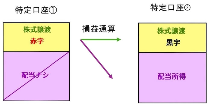 口座①は株式譲渡損失・配当等なし、口座➁は株式譲渡益・配当等ありのパターンです。