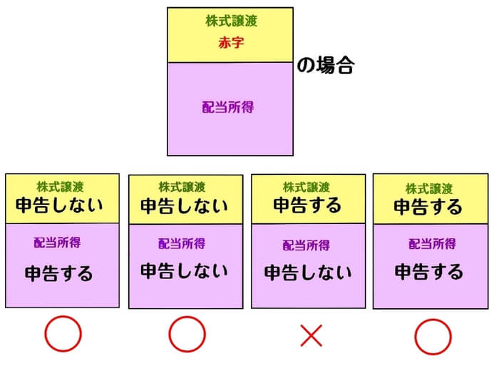 しかし、株式譲渡所得が赤字(損失)の場合、株式譲渡損失の申告をするのであれば、必ず株式譲渡損と配当所得はセットで申告する必要があります。