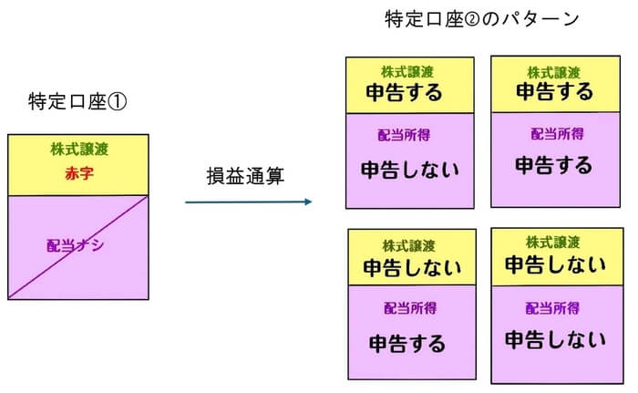 そして、株式譲渡損を他の特定口座の株式譲渡益や配当等と損益通算する場合、いくつかの申告パターンが存在します。